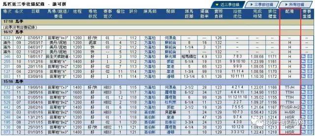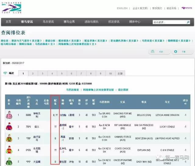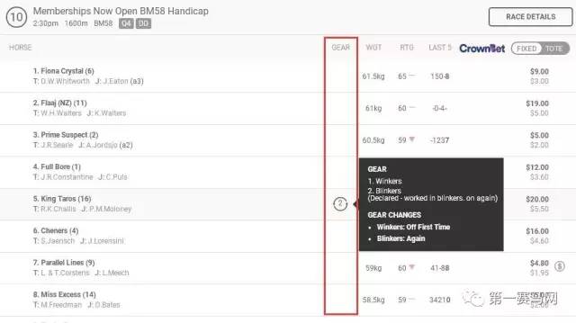 回顾【血统篇】关键字 Colour、chestnut、bay、grey、yo、Sex、Colt、Filly、Mare、Gelding、Ridgeling、Foal、Stallion、Sire、Dam、Sire of Dam、Owners、Trainer、Foal date、Career、Starts、Wins、Places、DP、DI、CD、Prizemoney/prize/Career Earnings…… 相关阅读: 至今,赛马业发达国家如英国、美国、爱尔兰、澳大利亚及新西兰等,都是使用第一语种,英语的国家。想要深入了解赛马行业,学习赛马相关英语术语势在必行。 比赛,是推动赛马行业进步的源源动力。年初,国际赛马组织联盟(International Federation of Horseracing Authorities,IFHA)公开的2015年年报数据中指出:美国,澳大利亚和日本在2015年举办了38941、18949和16049场平地赛,三者已占当年全球平地赛事总场数的51.9%,相对国内赛马发达的香港也仅举办了784场,在场数上也仅占据一角。 不管是海外赛马还是香港的赛马,排位表和赛果表等总会涉及相关赛马术语。第一赛马网小编今后将细细为大家整理涉及赛事相关的中英文对照-赛马术语,大家一起来学习吧。 【赛事篇の配备】术语中英文对照 小编结合几个使用频率最高的赛马网站,总结了一下赛事出现频率最高的赛马配备相关英文用语。 配备(Gears) 不要以为马匹在赛场上佩戴的各种配备都是随意,随时决定的。马匹若需要在比赛中使用配备,必须提前申请并且经过相关配备测试,如试闸等。若要除去相关配备,也同样需要提交申请和进行试闸测试,若试闸及格,则可除去。当然,以上是建立在赛马行业发达,赛马制度完善的国家或地区。对于赛马相对不发达的地区,相对就没那么严格。 ↓↓香港赛马会↓↓ ↓↓新加坡赛马会↓↓ ↓↓Racing.com↓↓ 各式眼罩 眼罩:Blinkers,缩写B 正确使用方法:眼罩必须佩戴于马笼头之下,并附有魔术贴绑带、带扣或扣夹。 眼罩包括全杯眼罩(Full cup Blinkers)和半杯眼罩(Half cup Blinkers)。 开缝眼罩:Visor,缩写V 单边眼罩:Blinkers with One Cowl,缩写:BO 防沙眼罩:Pacifier ,缩写P 半掩防沙眼罩:Pacifier with Cowls,缩写PC 头罩和耳塞 头罩:Hood,缩写H 耳塞:Ear Plugs,缩写E 各式箍 鼻箍:Shadow Roll ,缩写SR 正确使用方法:以不妨碍马匹呼吸为原则。 交叉鼻箍:Crossed Nose Band,缩写XB 羊毛面箍:Sheepskin Cheek Piece,缩写CP 单边羊毛面箍:Sheepskin Cheek Piece One side,缩写CO 羊毛额箍:Sheepskin Browband,缩写SB 舌带 绑系舌带 :Tongue Tie,缩写TT 正确使用方法:所有系舌带均需绕着马舌,然后绑在马匹的下颚处,而不得系在口衔铁或笼头上。系舌带必须时刻清晰可见。 系舌带必须为尼龙袜/带(nylon stocking/bandage)、皮带(leather strap)或者胶带(rubber band) 喉托 喉托:Cornell Collar ,缩写CC 佩戴喉托的目的在于防止马匹在高速奔跑时出现间歇性软腭向上移位的情况。 口衔铁 口衔铁:Bits 如今有各种类型的口衔铁可供使用,如标准口衔铁、防斜跑口衔铁、双杆形口衔铁、压舌口衔铁、橡胶口衔铁等。 其他 首次佩戴:“1” 除去:“-” 重新佩戴:“2” 如TT1:首次绑系舌带
