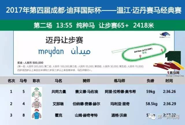 第二场比赛是迈丹让步赛(2418米),出闸后诸驹竞争激烈,最后是5号“共同力量”和4号“艾那瑞”并驾齐驱,势均力敌,在冲线前,5号马“共同力量”借助自身后劲更足的优势,叮当马头,夺得第二场比赛的头马。
