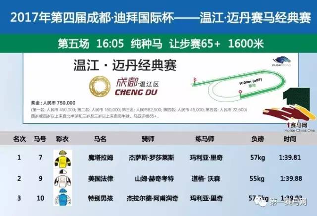第一赛马网获悉,今天的赛事共分五场,分别是温江冲刺赛(1400米)、迈丹让步赛(2418米)、广厦让步赛(1600米)、成都迪拜国际杯(2218米)、温江迈丹经典赛(1600米)等5场世界级的精彩赛事。其中第一场和第三场是中外骑师对抗赛,尤其备受关注。