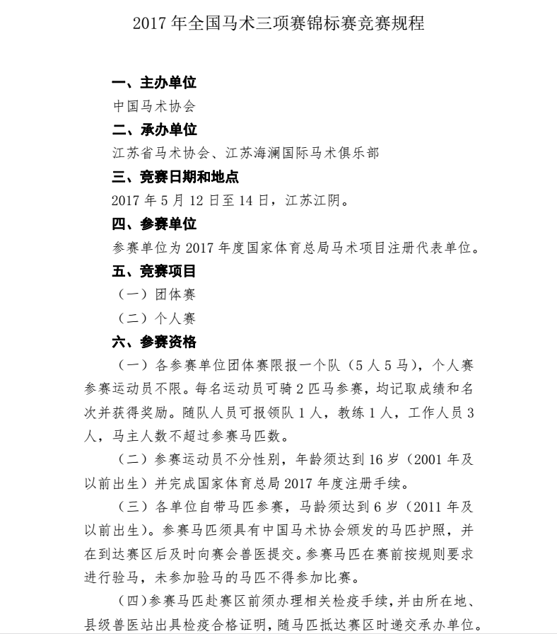 各有关参赛单位: 2017年全国马术三项赛锦标赛暨2017年十三运会马术项目三项赛资格赛(第一站)将于5月12日至14日在江苏海澜国际马术俱乐部举行。为使比赛顺利进行,现将赛事有关事宜通知如下: 一、报名 本次比赛报名请登录中国马术协会官方网站,在“信息管理”页面中进行注册和报名。所有报名单位及运动员须完成国家体育总局年度注册手续方可报名。报名截止时间为2017年5月8日,逾期报名,按不参加论。各队参赛运动员5月10日报到时须将赛事有效保险单发到赛事组委会。 二、报到 (一)报到时间: 各参赛代表队于5月10日到赛区报到。 (二)报到的所有费用由运动队自理,如需提前到赛区训练的队伍,务必于赛前6天与赛区联系,以便安排。 (三)报到时各代表队必须携带马匹护照并交验有效的马匹健康证明,必须遵守大会安排的训练时间和场地进行训练。 (四) 海澜国际马术俱乐部交通路线:沿S38常合高速向新桥方向行驶并进入新桥服务区/从新桥南收费站下高速/沿出口靠右行驶右转进入西环路/沿西环路行驶600米左右至红路灯路口左转进入新郁中路/沿新郁中路行驶600米左右至民乐广场(“国际花园城镇·新桥”楼牌建筑)雕塑处右转进入庄园路/沿庄园路继续行驶300米左右右转上大桥(友情提醒:桥面坡度较大)/直行即到达海澜飞马水城(原海澜国际马术俱乐部)。到达后由海澜飞马水城接待,请提前电话告知。 (五)运动队推荐酒店: 1.桃园山庄大酒店(五星级,俱乐部内) 地址:新桥镇南环路888号。 价格:标准间:488元/天(周日-周四),638元/天(周五、周六),。大床房:558元/天(周日-周四),738元/天(周五、周六),。 联系人:营销部 张梅梅 (15106160565) 2. 海澜大酒店(五星级,距离俱乐部10分钟车程) 地址:江苏省江阴市新桥镇陶新路8号。 价格:标准间:270元/天,大床房:350元/天。 联系人:营销部,徐洁(13806163341) 3. 海澜商务楼(商务酒店,距离俱乐部10分钟车程) 地址:江苏省江阴市新桥镇陶新路8号。 价格:豪华标准间:129元/天,豪华大床房:139元/天。 普通标准间:99元/天,普通大床房:109元/天 联系人:营销部,徐洁(13806163341) 以上价格为团体价格,建议各运动队及工作人员订房时,说明是参加2017年全国马术三项赛锦标赛暨2017年十三运会马术项目三项赛资格赛(第一站)的相关人员。 三、有关收费标准 (一)马厩费:大会负担参赛队比赛期间(赛前2 天至赛后1 天)5匹报名马匹的马厩费,超出部分各参赛运动队自理。 100元/马/天(不含饲料费)。 (二)伙食费:各参赛运动队自理。 (三)承办单位可提供马料,收费标准为: 苜蓿草:4.0元/公斤 青干草:4.0元/公斤 稻壳:15元/包 四、检验检疫 根据竞赛规程规定,各参赛运动队的参赛马匹须按规定注射注射马流感疫苗,以保障本次比赛顺利进行。承办单位将协助各参赛运动队办理及开具检验检疫证明。 五、联系方式 (一)自剑中心马术部 联系人:范珩 电 话:010-68862550 传 真:010-68862596 (二)运动队报名联系人: 联系人:靳彤琳 电 话:18611668659 邮 箱:ceacppx@126.com (三)运动队报到联系人: 联系人:宋婷 电 话:15061551571 中国马术协会 2017年4月24日