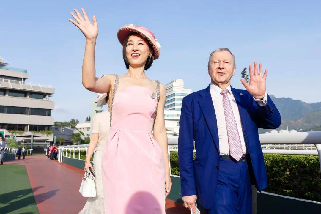 「莎莎妇女银袋日2025」形象大使高海宁小姐与香港赛马会行政总裁应家柏先生在栏边欣赏第七场赛事——总奖金420万港元的三级赛莎莎妇女银袋(让赛)。