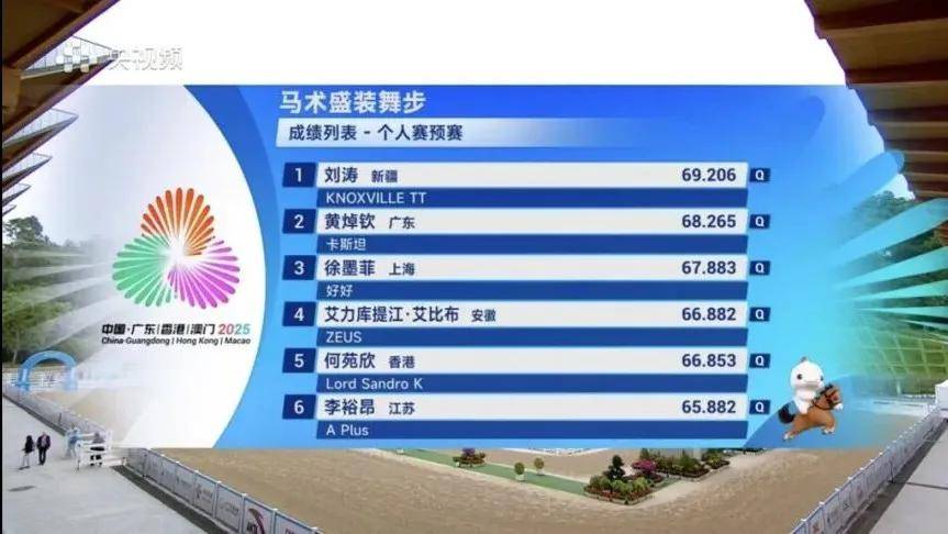 经过精准与艺术的较量,新疆队刘涛搭档“KNOX VI LLE TT”以69.206分技压全场,拔得头筹;广东队“定海神针”黄焯钦携“卡斯坦”以68.265分稳居次席;上海队00后新锐徐墨菲骑“好好”以67.883分跻身前三。安徽队艾力库提江·艾比布、“ZEUS”组合66.882分位列第四;香港队何苑欣与“Lord Sandro K”以0.029分微弱差距屈居第五;江苏队李裕昂锁定第六。