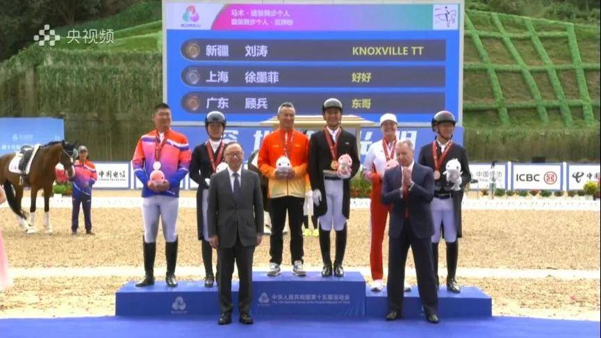 经过一番激烈的技能与艺术比拼,最终,新疆队刘涛策骑“KNOX VI LLE TT”以72.425分技压群雄,为新疆军团再添一金;上海“00后”徐墨菲携爱驹“好好”以69.520分摘银,广东老将顾兵驾驭“东哥”以69.045分夺铜,南粤马术再登全运领奖台。香港赛马会主席廖长江先生、行政总裁应家柏先生为获奖者颁奖。