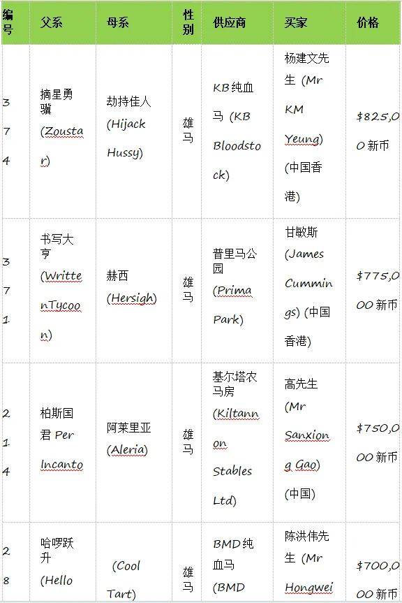 编号374的“摘星勇骥”(Zoustar)雄马由KB纯血马(KB Bloodstock)调训呈现,以825,000新币(折合人民币约332.4万元)成为本届标王,由中国香港买家杨建文(Mr Yeung Kin Man)购入。纯血马代理威利·梁(Willie Leung)透露:“杨先生尤为青睐本拍卖会,首年购入的两匹赛驹已九度夺冠。此驹体型壮硕、早熟特质显著,或将提早运抵香港。”这匹标王亦是杨建民本次16项购马计划中的重点。