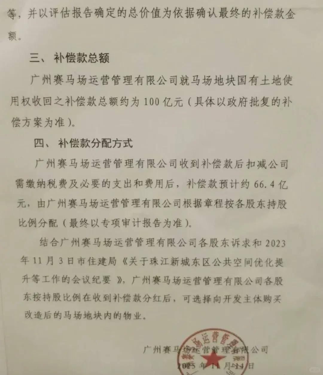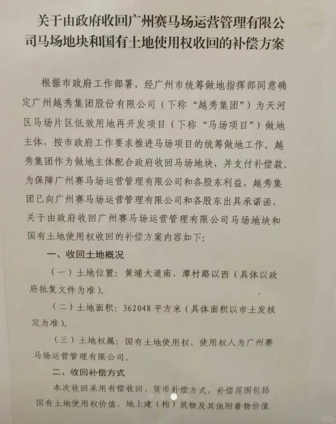 广州赛马场运营管理有限公司于11月14日发布的《补偿方案》中,透露了马场地块的相关补偿方案内容。其中提到,收回土地位置为黄埔大道南、潭村路以西(具体以政府批复文件为准),土地面积为362048平方米(具体面积以市土发核定为准)。广州赛马场运营管理有限公司就马场地块国有土地使用权收回的补偿款总额约为100亿元,最终以政府批复的补偿方案为准。