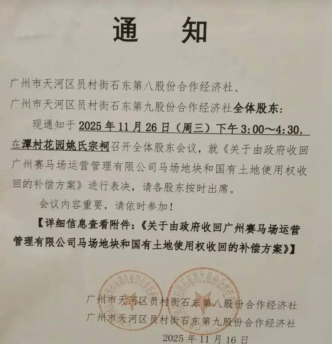 11月17日,记者从相关公告中获悉,11月26日,广州市天河区员村街石东第八股份合作经济社、第九股份合作经济社将召开全体股东会议,就《关于由政府收回广州赛马场运营管理有限公司马场地块和国有土地使用权收回的补偿方案》(以下简称《补偿方案》)进行表决。
