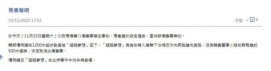 11月15日第八场赛事中,赛驹“超越梦想”出闸后将骑师潘明辉抛落,随后更掉头奔跑,未能被捉回。赛事进行至中段,现场响起讯号及亮起灯号,宣布赛事取消并安排退款,以确保人马安全。