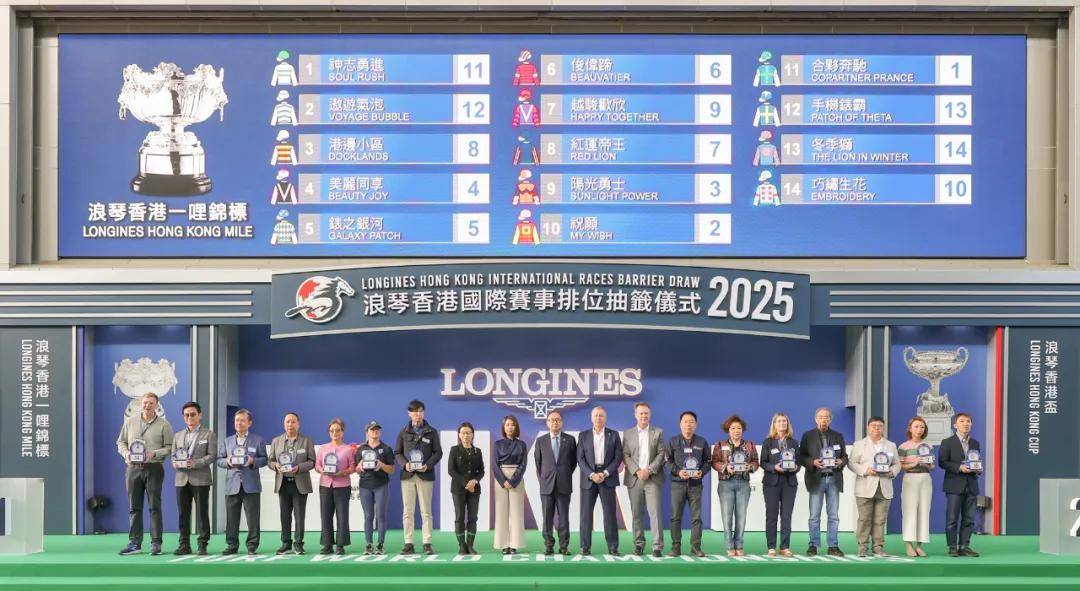 浪琴香港一哩锦标排位抽签完成后,与各驹的马主、骑师及代表合照