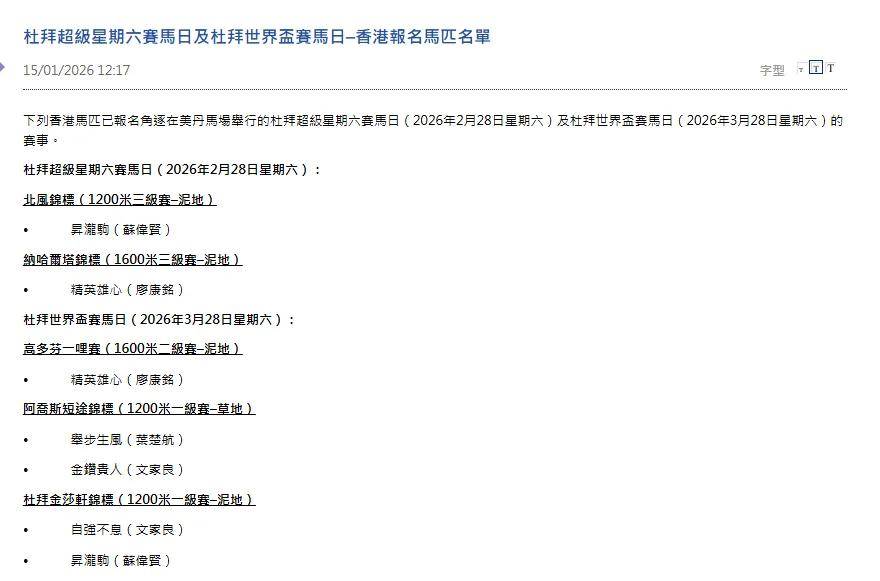 香港赛马会也同步公布了迪拜世界杯赛日及超级星期六的报名名单。另有两匹将直指迪拜世界杯赛日的赛驹,分别是“举步生风”(Fast Network)与“金钻贵人”(Lucky Sweynesse),二者均报名阿乔斯短途锦标。此外,“升泷驹”(Sing Dragon)则报名了北风锦标及杜拜金莎轩锦标。而下周三将出战二班1650米赛事的“精英雄心”(Talents Ambition),则同时报名了纳哈尔塔锦标与高多芬一哩赛。