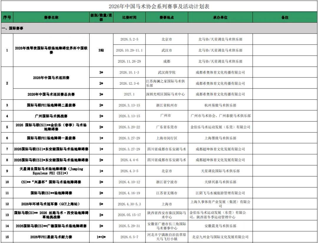 近日(1月13日),中马协在其官网及微信公众号正式公布2026年中国马术协会系列赛事及活动的相关承办单位名单。公示期为5个工作日,公示截止日期为2026年1月20日。在公示期结束后30个工作日内,中国马术协会将和所有承办单位与正式签署赛事合作协议(所有承办单位必须是中马协团体会员)。延期签署视为赛事承办单位自动放弃承办该项赛事。