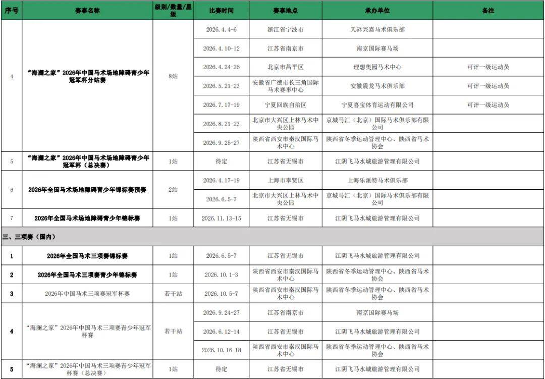 第一赛马网了解到,中国马术协会本次公布了国际马术赛事、国内马术场地障碍、国内三项赛、国内盛装舞步、国内耐力赛、马球、U系列比赛以及速度赛马赛事的承办单位。