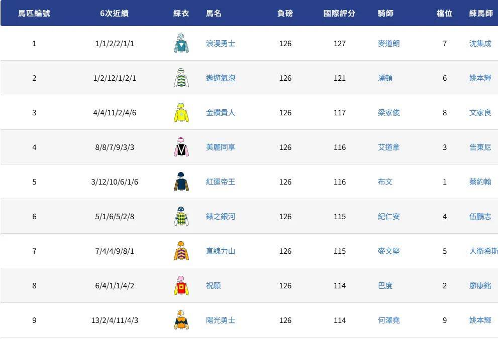 根据香港赛马会今日(1月22日)所对外发布的董事杯马匹排位表,“浪漫勇士”和“遨游气泡”将分别从7号档和6号档起步。