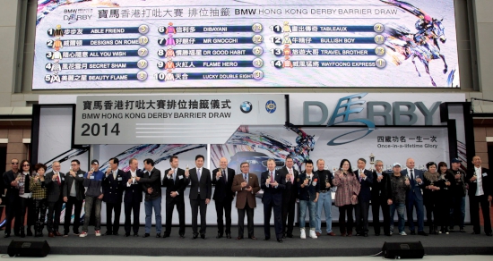 本周日(3月16日),本届宝马香港打吡大赛将于沙田马场上演。这项总奖金高达一千六百万港币的2000米大赛的排位抽签仪式,已于昨日(3月13日星期四)早上在沙田马场马匹亮相圈举行。十四匹参赛马的练马师及马主看来对其参赛马匹所抽得的档位均感满意。