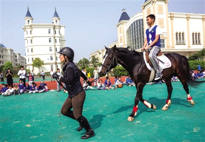 昨天(4月9日)上午,温州第二外国语学校的操场上来了两个特殊的客人。马术“盛装舞步”课程进入了校园。马术俱乐部教练骑着高头大马,为孩子们示范“盛装舞步”,并讲解了骑士精神和马术知识,示范如何与马打招呼。现场的孩子们还与马进行亲密接触。