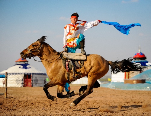 4月21日,马术队队员在进行马术表演。 当日是甲午年成吉思汗春季查干苏鲁克大典暨首届鄂尔多斯民俗文化节的第六天,在内蒙古鄂尔多斯成吉思汗陵附近的那达慕会场,成吉思汗陵双骏马术队献上了精彩的蒙古族传统马术表演。