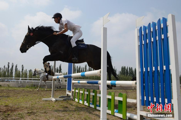 6月25日,在内蒙古农业大学职业技术学院的马场上正在进行着马术比赛,选手和马儿配合默契,在赛场上飒爽英姿。记者观察到,比赛坐骑中有十匹香港退役的英纯血马,颇吸引眼球。
