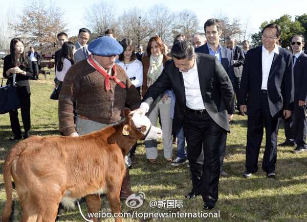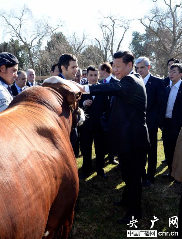习近平受到农场主莫内塔家人热情迎接。莫内塔向习近平介绍,庄园畜养牲畜近万头,培育了许多优秀种马和肉牛品种。习近平边听边详细询问牲畜养殖和农场经营情况。习近平指出,阿根廷是农牧业大国,农业现代化水平和科技水平很高。中国也是农业大国。中国要发展,必须首先解决好13多亿人口吃饭问题。中国高度重视农业,坚持立足国内、确保粮食自给自足,同时积极利用国际市场,参与国际合作,调剂农副产品。中方愿意同阿方加强农业领域合作,扩大农产品贸易。