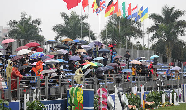 盛装舞步表演赛结束后,志愿者和工作人员迅速开始摆设障碍,准备稍后进行的120-130cm 香港赛马会冠军赛。此时雨越下越大,体感也越来越冷了,看台上的观众都撑起了花花绿绿的伞,依然坚持等待比赛开始,骑手们进场观看路线,有的撑伞,有的戴帽子,有的淋着雨,构筑了赛场内另一道风景。11点,雨小了一些,比赛准时开始,28位骑手依次出场冒雨比赛,雨水打在骑手服和头盔上能够看到清晰的水珠。最终有8位骑手进入了Jump off争时赛,在争时赛中,来自乌克兰的乌尔里奇•基尔霍夫在一个拐弯处,马腿侧滑险些摔倒,观众不禁惊呼并捏了一把汗,最终他以33秒83的成绩夺得了冠军。中国香港的林立信(35秒85)和英国的本•马赫(37秒29)分获亚军和季军。