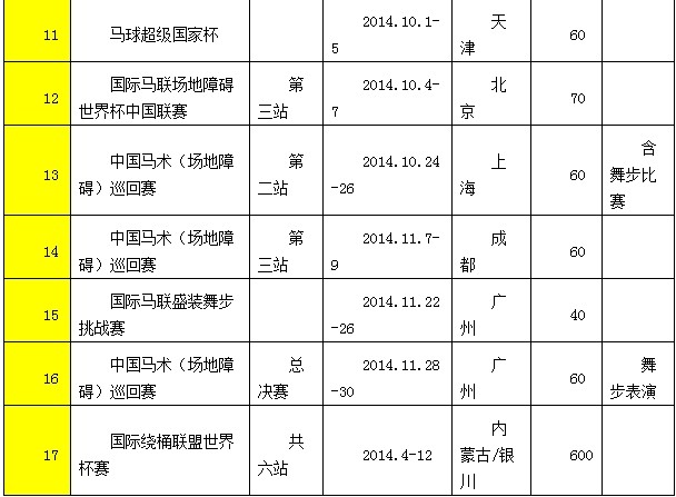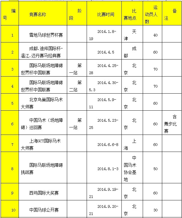 2014年在中国大陆地区举办的国际马术、马球赛事已由中国马术协会正式公布。每一项比赛都进入了成熟期,都异常精彩,希望马迷们安排好自己一年的比赛观看计划,享受马术、赛马、马球运动的魅力和带给自己的快乐。