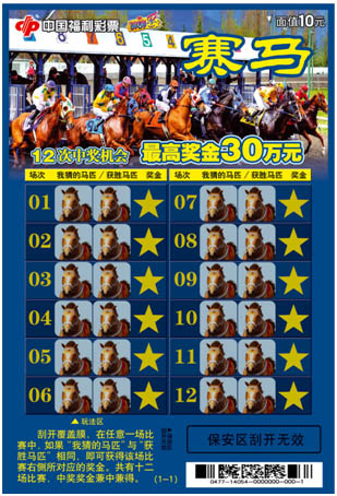 2015年1月5日起,以赛马运动为主题的福彩刮刮乐新票种“赛马”在沪上市。彩票单张面值10元,11个奖级,最高奖金30万元。游戏规则:刮开覆盖膜,在任意一场比赛中,如果“我猜的马匹”与“获胜马匹”相同,即可获得该场比赛右侧所对应的奖金。共有十二场比赛,中奖奖金兼中兼得。