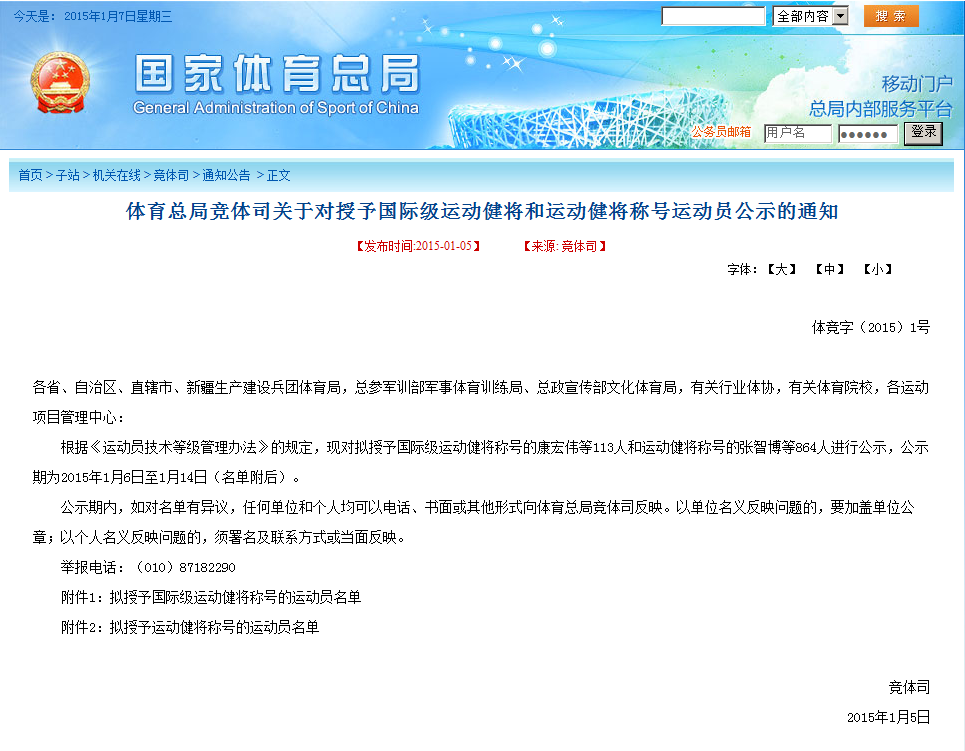 摘要:1月5日,国家体育总局在其官方网站上发布了《体育总局竞体司关于对授予国际级运动健将和运动健将称号运动员公示的通知》