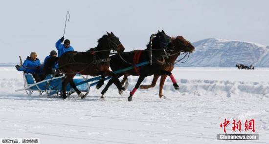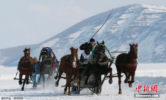 当地时间3月14日,俄罗斯西伯利亚城市克拉斯诺亚尔斯举办赛马节。参赛选手在冰天雪地里或驾马车或骑马进行比赛。