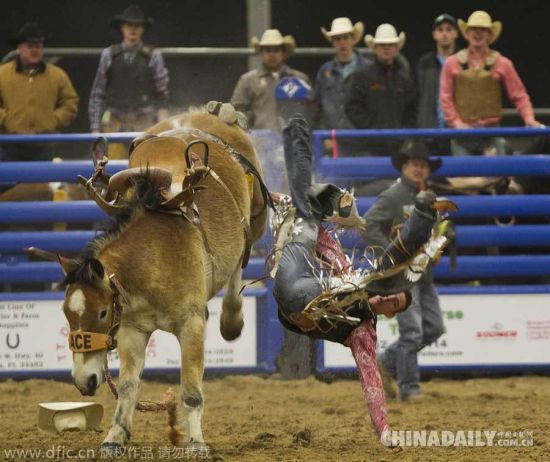 摘要:当地时间2015年2月14日,美国佛州奥卡拉,佛州高中马术协会举办周六之夜表演赛,来自各州的高中生在无鞍骑野马、套羊、扳小牛、骑牛等项目中一决高下。
