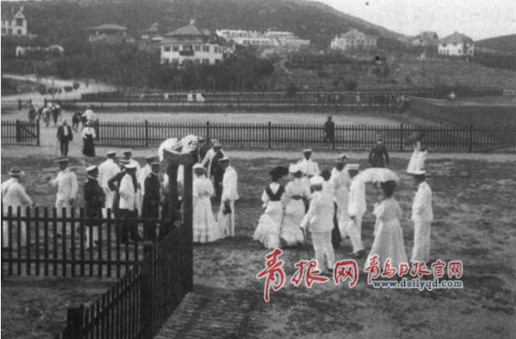 栅栏围绕的马场跑道,四周草地上围观的士绅和贵妇名媛们(胶州帝国法院法官贝麦摄)