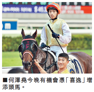何泽尧当天策骑马匹“喜宝驹”出战香港本地三级赛“国庆杯”,虽然在位置不利的闸厢起步,但起步后积极策马移离不利场地,并让马儿在前列放松竞跑,待最后阶段才大力催策,其控制缰绳和打鞭的功架,甚有外籍好手的风采。
