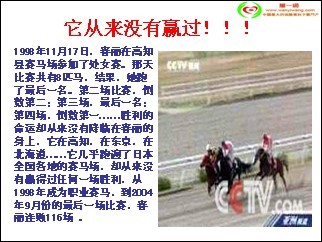 春丽是日本一匹明星赛马。它之所以成为明星,不是因为它能征善战,恰恰相反,在它的赛场生涯中,它从来没有赢过。在它连败第88场时,高知县报纸对它作了专门介绍,由此一举成为当地的明星。它迎来第100场连败时,国家电视台NHK作了专题报道,使它一夜间在日本家喻户晓。越来越多的人专程来看它,明知道它赢不了,还是大把地买它的马票,作为礼物送给朋友。
