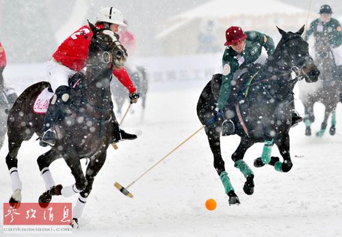 资料图片:2013年2月3日,在天津环亚国际马球会举行的富国高银雪地马球世界杯赛季军争夺赛中,英国队选手奥利夫(左前)与南非队选手麦肯齐(右前)争抢。新华社记者岳月伟摄