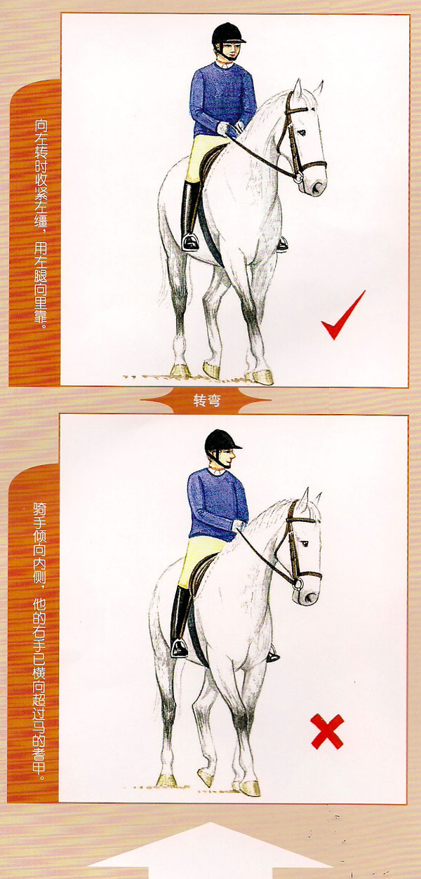 转向:向左转时,骑手应保持体重均等的分配到两坐骨上,左腿向里靠,脚趾不要向外转,握紧左手手指,加大与左侧缰的联系。当马开始转弯时它的脖颈会向前进 的方向屈挠。骑手轻微地向前移动右缰,给它一点。但是不能丢掉右缰,在骑手的手和马嘴之间必须继续保持很好的联系。如果右缰太松,马匹只把脖颈转向左侧然 而继续直线前进而没有转向。