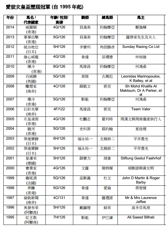 但到目前为止,仍未有香港赛驹能取得与上述三匹海外代表相同的成就。自2001年以来,共有七匹曾胜出香港国际赛事的香港赛驹于同一马季较后时间出争爱彼女皇杯,最佳成绩却止于 2012年香港杯冠军“加州万里”在爱彼女皇杯的一席亚军,该驹在 2013年的爱彼女皇杯仅不敌“军事出击”跑第二名。其余六匹曾扬威香港国际赛的本地代表,其后在爱彼女皇杯中均未能上名。
