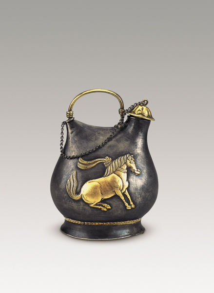 银壶造型采用我国北方游牧民族常用的皮囊壶的形状,壶身为扁圆形,上方一端开有竖筒状的小壶口,上置覆莲瓣式壶盖,盖顶铆有一银环,环内套接一条银链与弓状提梁相连。壶腹两面以模压的方法分别捶击出两匹奋首鼓尾、衔杯匐拜的舞马形象。舞马长鬃覆颈,长尾舞摆,颈上系结飘于颈后的彩带流苏。后腿曲坐,前腿站立,全身呈蹲踞姿态,张口衔着一只酒杯。由于是锤凸成像,马的形象凸起于银白的壶体表面,具有一定的立体感,显得十分华美。银壶通体经抛光处理,银光铮亮,舞马及壶盖、提梁等均鎏金,色彩上黄白辉映,富丽堂皇,充分展示了大唐文化的辉煌灿烂。
