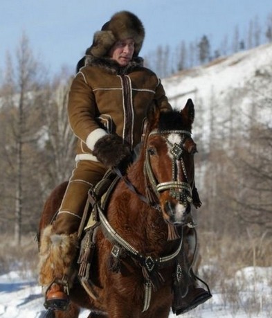 2010年3月9日,俄媒体刊登了普京在户外骑马的照片。普京在对西伯利亚卡卡西亚进行工作访问时忙里偷闲,穿上羊皮袄,戴上皮草帽,骑马踏雪,举手投足间尽显硬汉气魄。