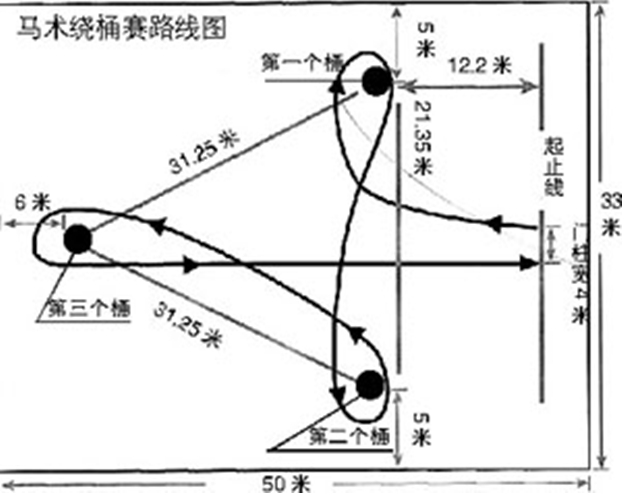 一、绕桶赛是使用3个相同的桶,按苜蓿叶形状摆放的一个预定的比赛项目。在赛场内分别按标准尺度、标准距离放置三个铁桶为绕行标志。