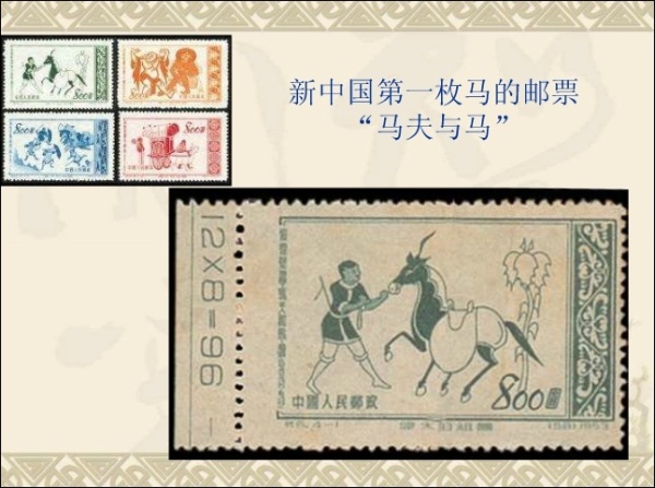 新中国最早出现的“马”文物图案邮票是1953年发行的特6“伟大的祖国”(第三组,敦煌壁画)中的第一枚“马夫与马”。