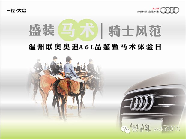 即日起至6月26日前,在温州联奥购奥迪A6L即可参加温州联奥奥迪4S店将于6月28日下午14:00在丽岙凯易路马术俱乐部举办的“盛装马术·骑士风范” -- 温州联奥奥迪A6L品鉴暨马术体验日活动。
