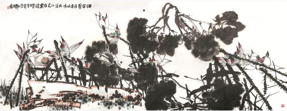 几丛盛开的莲花,倚石而绽。周敦颐曾在其《爱莲说》中提到“莲出淤泥而不染,濯清涟而不妖,中通外直,不蔓不枝”。此中莲花在这一派傲骨中,更现其蓬勃绽放之活力,而几朵墨色晕染而成的荷叶,穿插其间。整幅作品气韵高洁又不失大气磅礴。
