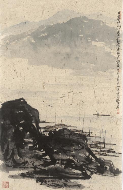 以寥寥数笔焦墨,勾勒出海边山峦之造像,几只小船行驶其中,衬着远处淡墨山影,一种东方特有的浪漫诗意,回荡期间。