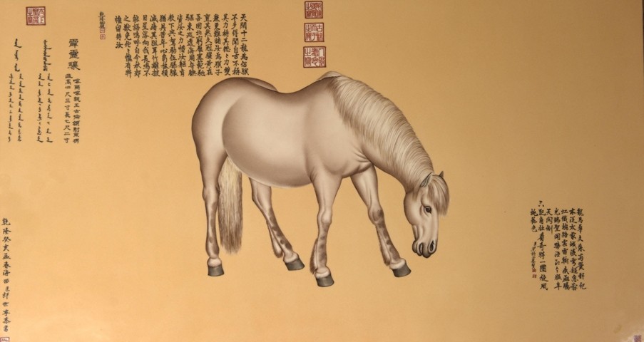 《明皇试马图》是唐代画马名家韩幹之作,描绘了唐玄宗在臣子护持下端坐于马上。尽管原作不知所踪,但乾隆对此图有着异乎寻常的钟爱,曾令人以不同材质据此制作了数件挂屏,意在以古警今,告诫清王室子孙勿忘骑射,不要重蹈前朝积弱衰败的命运。
