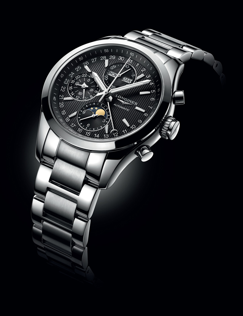 浪琴表推出全新康铂系列月相腕表(Conquest Classic Moonphase),作为康铂系列中最新加入的计时秒表,新款同时彰显品牌对马术运动的热忱和对制表传统的重视。这款计时秒表直径42毫米,拥有精钢表壳,配备自动上链机械机芯L678。黑色表盘上9个条状应用时标涂有Super-LumiNova夜光涂层,优雅地烘托出月相显示功能。6时位置设有12小时计时盘,9时位置设有24小时显示功能与小秒针,12时位置则设有30分钟计时盘与星期显示,日期通过半月形中心指针指示。防水功能均达到5巴,机芯运作可通过透明表背一览无余。配以精钢表链,采用三重折叠式安全表扣。