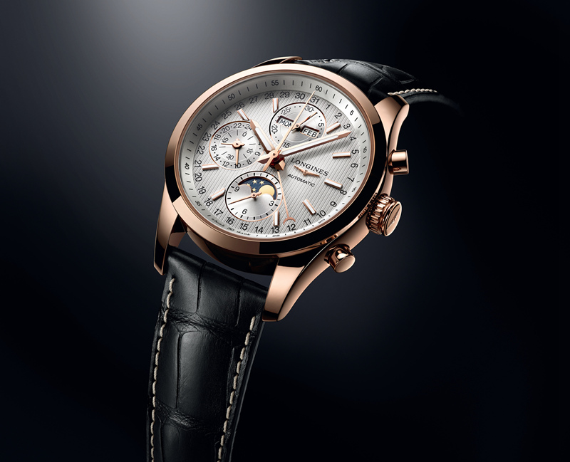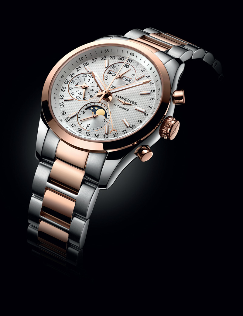 浪琴表康铂系列精钢玫瑰金月相计时腕表