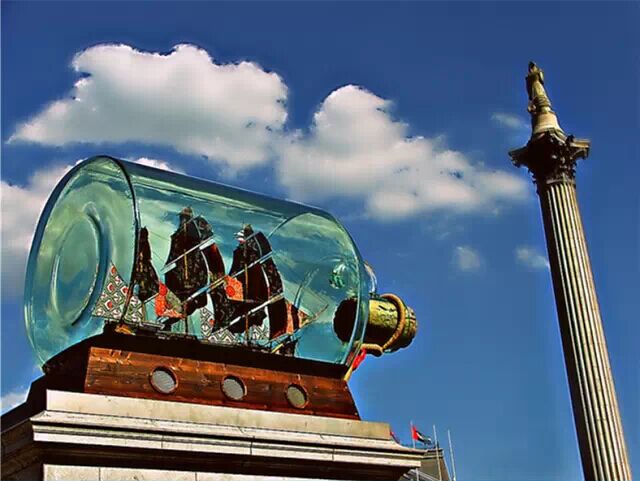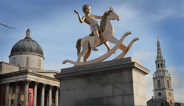 说到特拉法加广场,除了以“鸽子广场”闻名于世外,位于广场四角的四柱基也是个亮点。这四座柱基的其中三座已经站上了历史名人、帝王将相,只有广场西北角的第四柱基一直空着。九十年代末,皇家艺术学会开始征集艺术作品,轮流摆放在这座柱基上,受到了公众的一致欢迎。