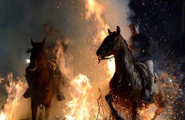看西班牙勇敢的骑士们是如何骑上心爱的坐骑穿过熊熊燃烧的火堆?