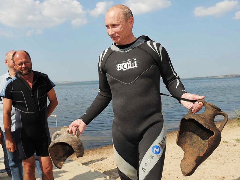 2011年8月10日,塔曼半岛(Taman Peninsula),普京拎着潜水时发现的两个6世纪古董。不过他后来承认这两个古董是提前置于水下给他“寻找”的。