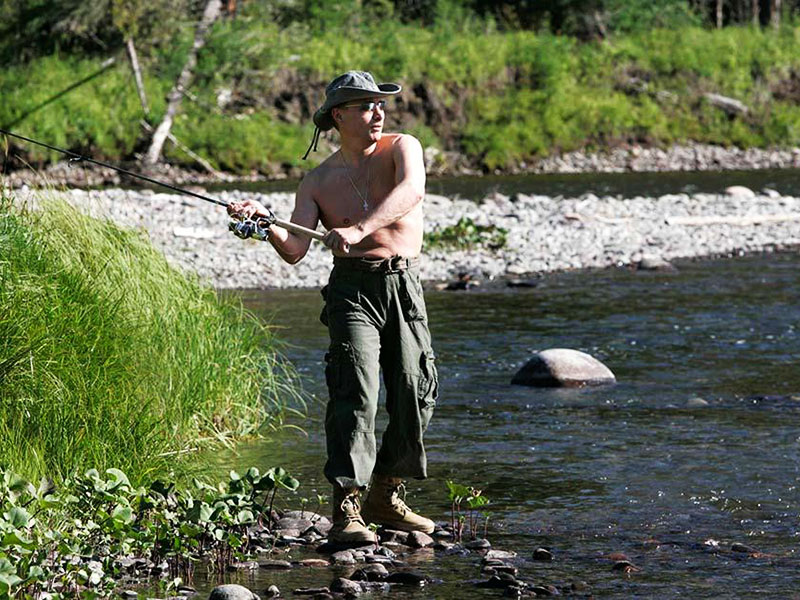 2007年8月13日,普京在叶尼塞河(Yenisey River)河岸垂钓。