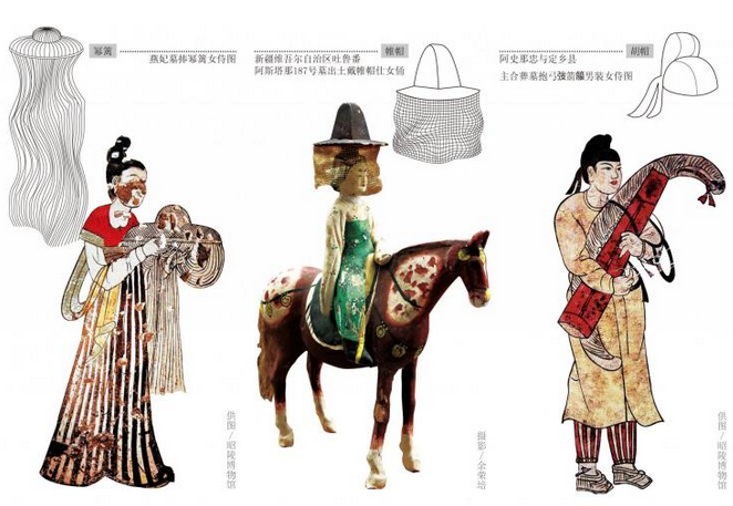 据说,唐宋时期,妇女骑马出行,必戴“帷帽”,女子的衣裙早期瘦而长,裙系在胸上。帷帽是一种藤席编的、周围装上罔纱的笠帽,比幂篱简洁轻便,吐鲁番阿斯塔那墓出土了一件唐代西州时期的帷帽骑马女俑,证实了“皆用帷帽,拖裙到颈,渐为浅露”的流行风气。