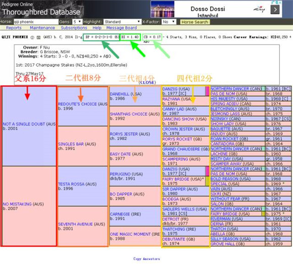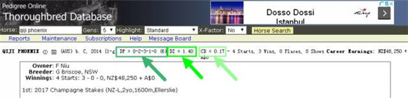 举例:以近日确认加盟悉尼全球闻名的华礼纳马房(Chris Waller Racing),与世界知名赛驹“云丝仙子”(Winx)成为舍友的“骐骥凤凰”(Qiji Phoenix)为例,马主天津骐骥马术俱乐部董事长牛福东(F Niu)。DP=0(B)-2(I)-3(C)-1(S)-0(P)