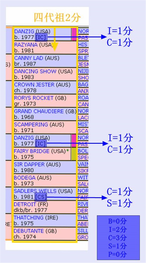 (按照四代祖2分;一匹马拥有两种类型,则分数平分;可重复)